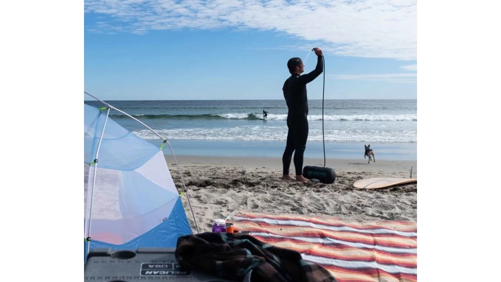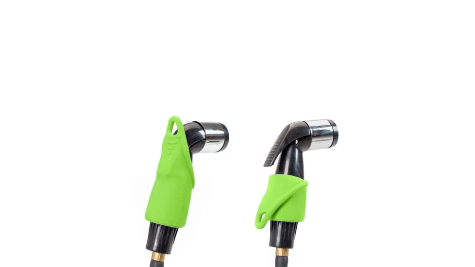 Refill Helio anywhere, even without a hose. The 7-foot neoprene hose is long enough to hold it overhead for a shower, or to reach all angles of dirty gear, muddy paws, or salty wetsuits. Pair with Heliopolis privacy shelter, which has a fitted nozzle holder for hands-free overhead showering, for the ultimate home-away-from-home shower in the backcountry.