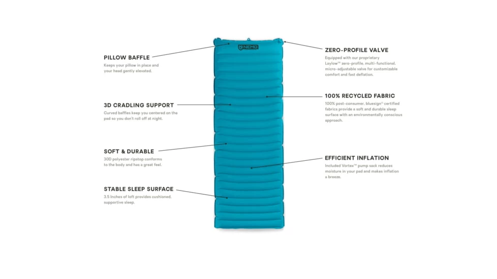 Quasar 3D makes a leap forward in sustainability with our first ever bluesign Certified sleeping pad. The durable 30D polyester ripstop is made of 100% post-consumer recycled materials that conform to the body and have a great feel. Our custom Laylow zero-profile, multi-functional valves, combined with our included Vortex pump sack, allow you to inflate and deflate quickly and easily make micro adjustments for maximum comfort.