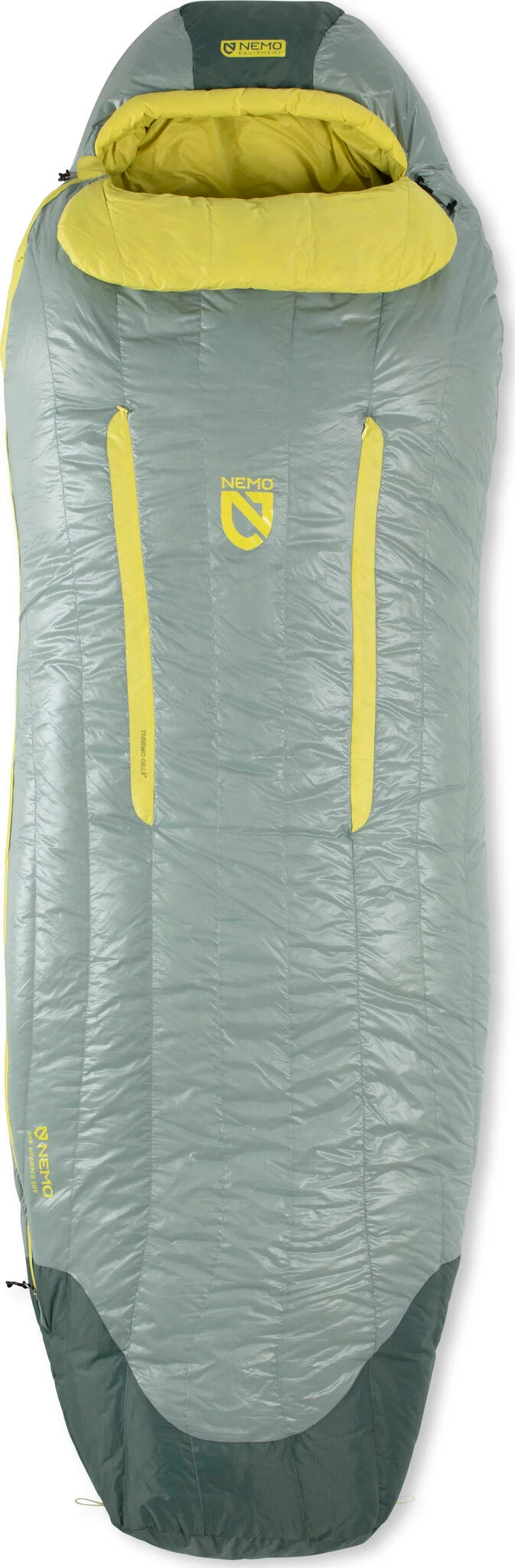 Riff™ is NEMO’s top-of-the-line backcountry-oriented Spoon™ shaped sleeping bag. This pinnacle performance 3-season 800FP down bag offers a more athletic cut, designed for side sleepers who prefer space-saving packability and shaving critical ounces for long hours on the trail. Seventy percent of people sleep on their side, yet mummy bags are not designed to accommodate this. NEMO’s unique Spoon™ shaped bags offer more room at the elbows and knees, allowing side sleepers to shift positions comfortably throughout the night. This popular bag is loaded with features, including Thermo Gills™ that help regulate temperature during the night, Blanket Fold™ that provides tucked-in comfort, and a waterproof/breathable footbox to withstand tent condensation. Left-sided zippers on Men’s and right-sided zippers on Women’s allow Riff™ to zip together for a double bag.