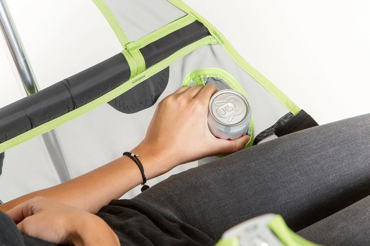 • Le porte-gobelet intégré anti-dévers garde vos boissons à portée de main et la poche de rangement est dimensionnée pour les tablettes, les clés ou votre livre préféré.