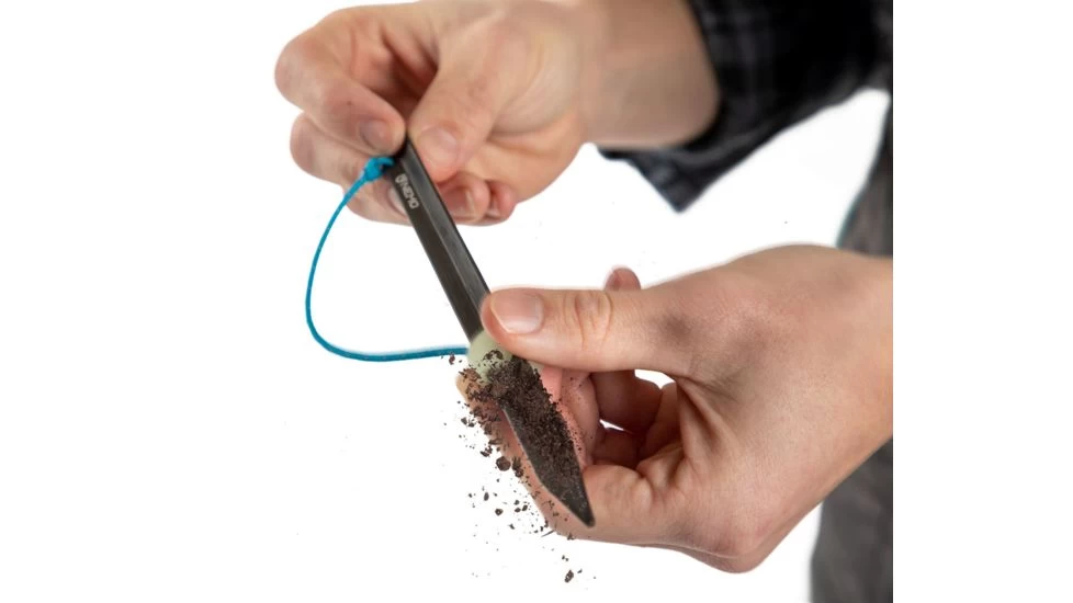 Sweepstake eliminates the problem of dirt sticking to your tent stake. The durable, tethered polymer biscuit not only swipes your stake clean – it also glows in the dark, saving you from tripping on stakes and guylines at night.![]()